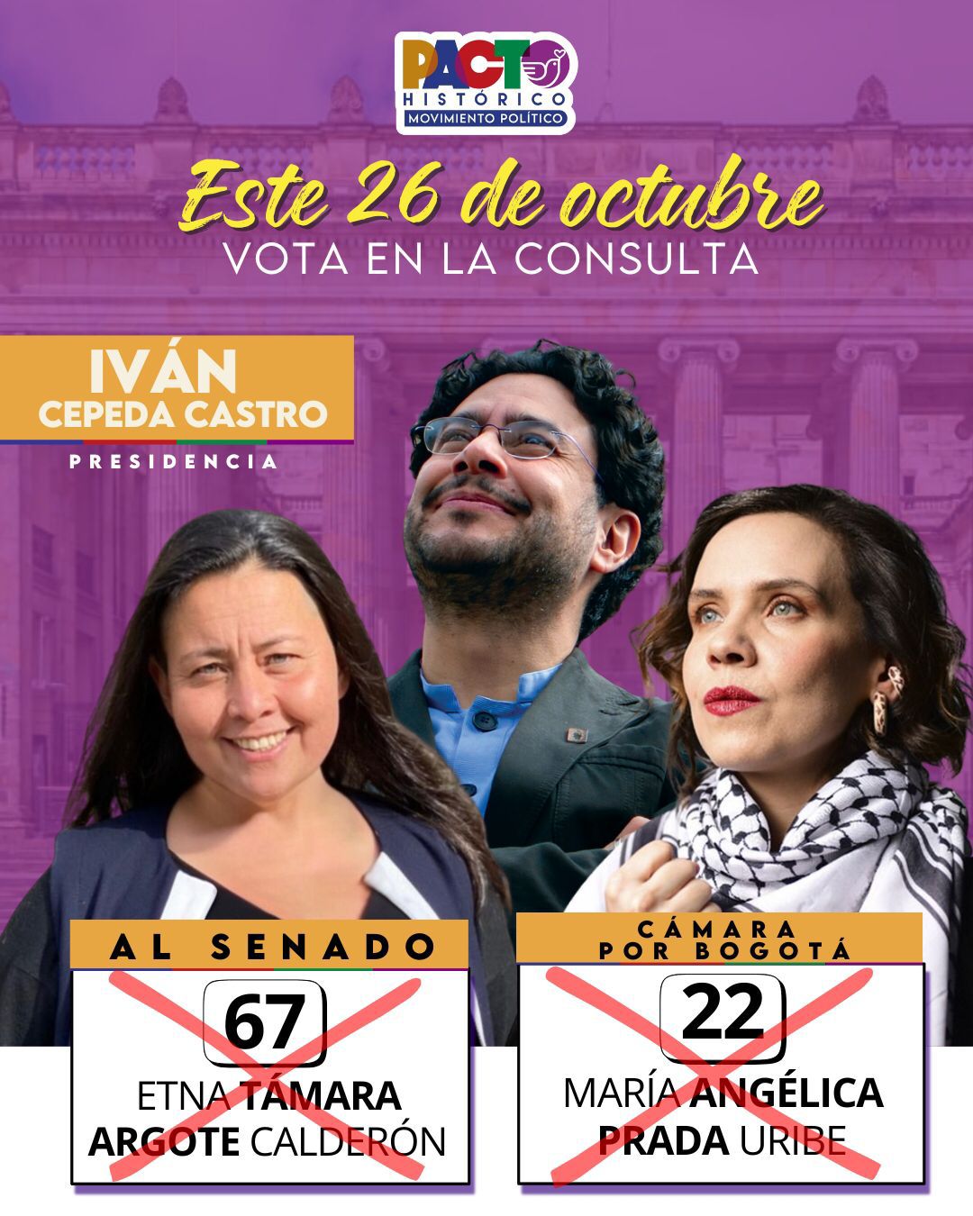 Vota por Etna Támara Argote Calderón al Senado (#67), María Angélica Prada a la Cámara por Bogotá (#22), e Iván Cepeda Castro a la Presidencia.